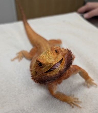 A 4-year-old female intact bearded dragon (Pogona vitticeps) presented on emergency to the Avian & Exotics department at GCVS for acute onset of severe neurologic signs a few hours prior to presentation. The bearded dragon was noted to have appropriate husbandry and diet. She had been getting treated for Blastocystis sp. with oral metronidazole the previous 2.5 weeks by their primary veterinarian. The patient was receiving a compounding metronidazole suspension at a dosage of 85mg/kg orally once daily for 14 days. She was also missing her left hind foot, which was a historic finding.